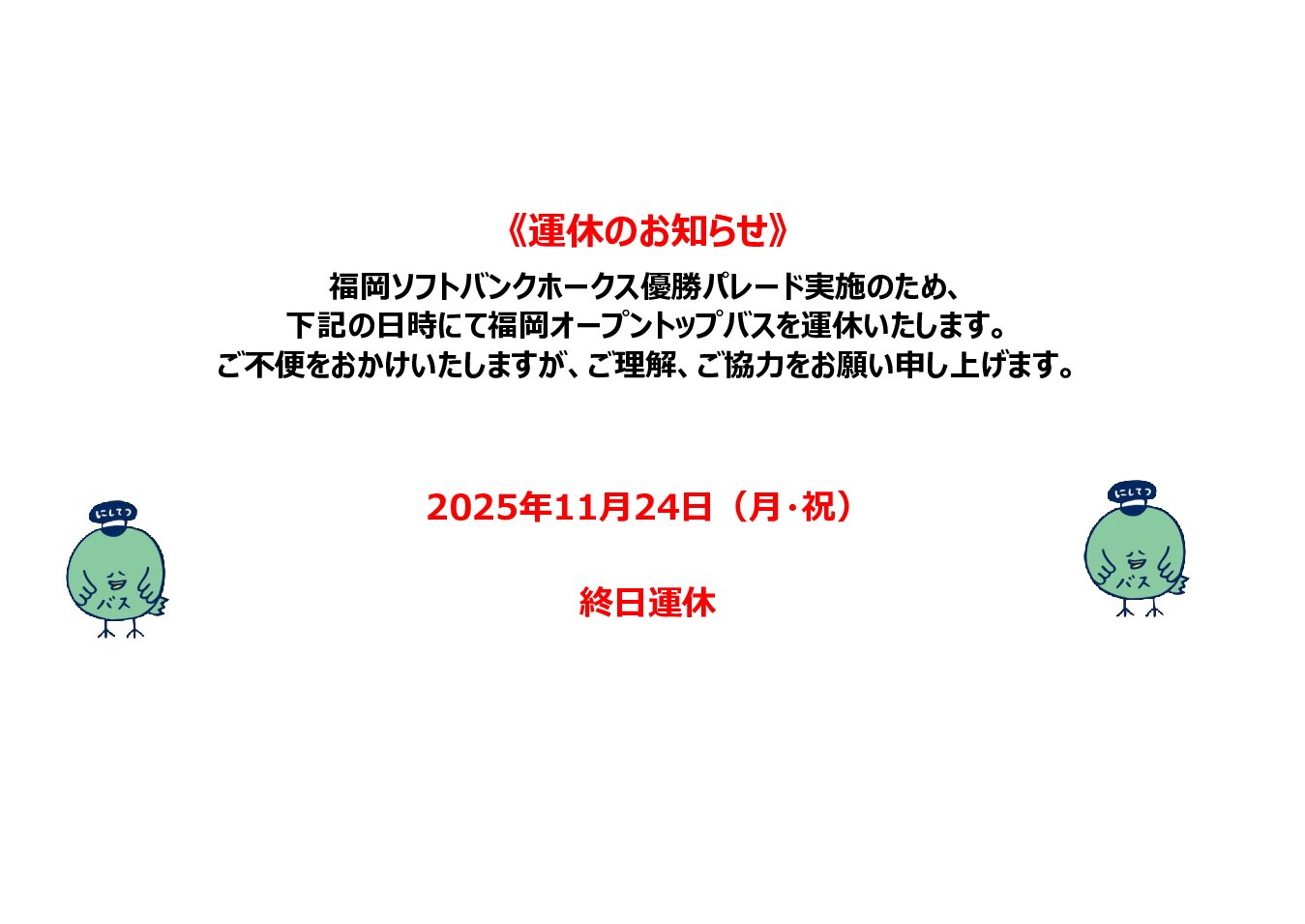 11/24(月・祝)は福岡ソフトバンクホークス優勝パレード実施のため、終日運休いたします。ご不便をおかけいたしますが、ご理解のほどよろしくお願いいたします。