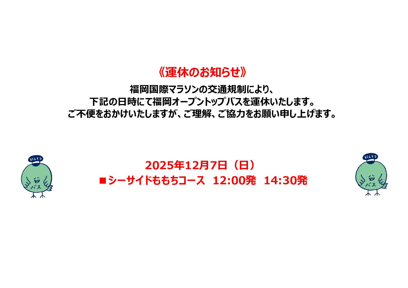 12/7(日)は福岡国際マラソンの交通規制により、以下の便を運休いたします。ご不便をおかけいたしますが、ご理解のほどよろしくお願いいたします。